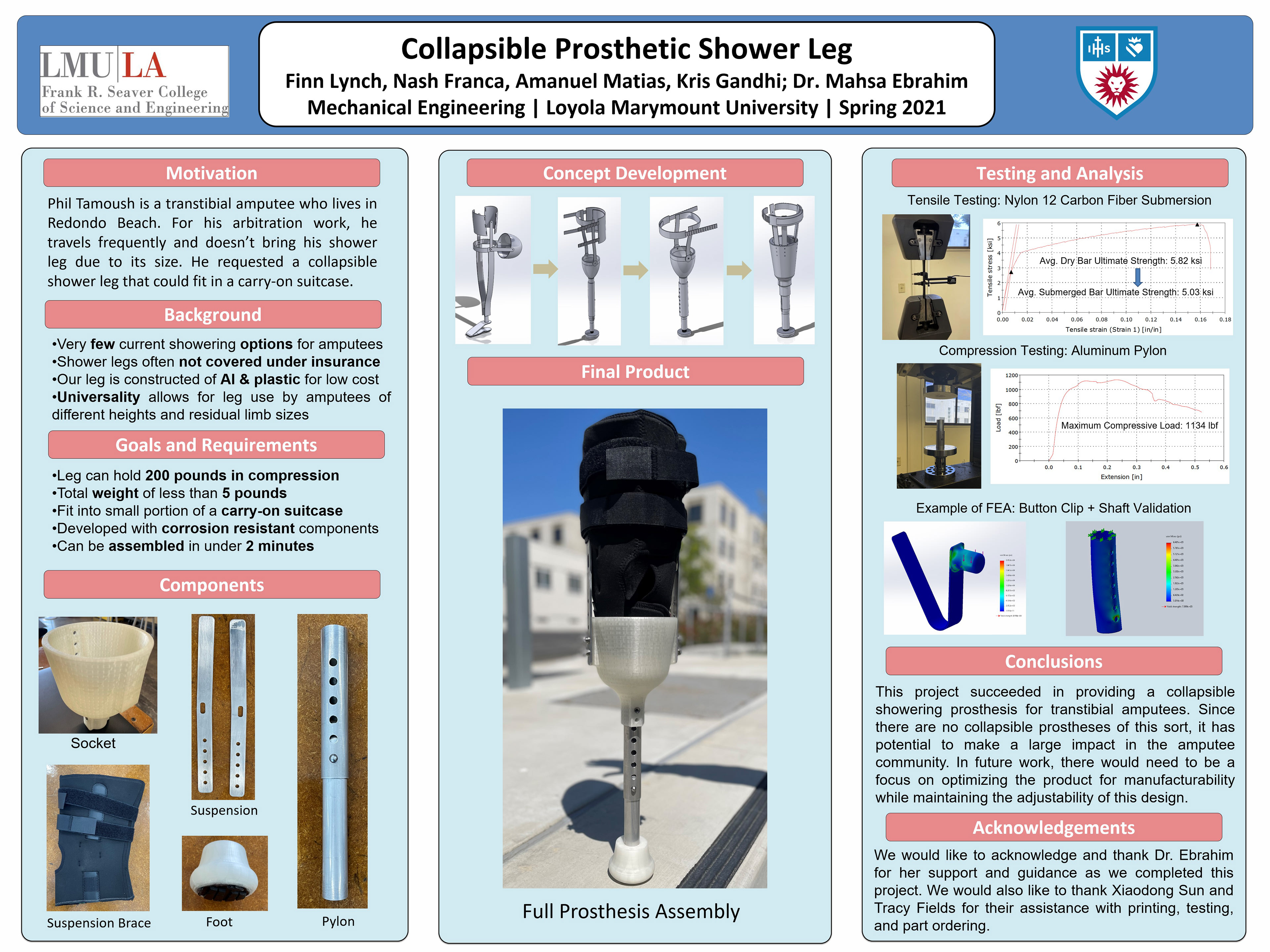 This design still has some flaws, mainly regarding stress concentrations and weak points in the brace. Analysis was performed on all parts of the leg and physical testing was performed on the pylon and interfaces major interfaces in the socket. The strength of the leg was found to be sufficient for Phil to do static standing tests (while being supported) such that he could give more realistic feedback on the comfort and ease of donning for the leg. Student will continue work on this project in the 21-22 school year and hopefully Phil will have the chance to try a more robust prototype.
